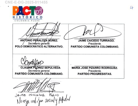 Lo anterior se desprende de la Resolución No 09673 del 17 de septiembre de 2025, “por medio de la cual se RESUELVE la solicitud de reconocimiento de personería jurídica del MOVIMIENTO POLÍTICO PACTO HISTÓRICO, como consecuencia de la fusión del MOVIMIENTO POLÍTICO COLOMBIA HUMANA, el PARTIDO UNIÓN PATRIÓTICA, el PARTIDO POLO DEMOCRÁTICO ALTERNATIVO, el PARTIDO COMUNISTA COLOMBIANO, el PARTIDO PROGRESISTAS y la “Minga Indígena Política y Social”, dentro del expediente identificado con el radicado CNE-E-DG-2025-011455.