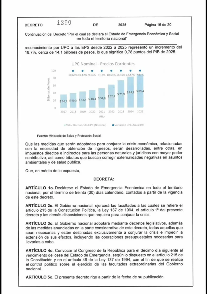 “De hecho, el Gobierno Nacional adelantó todas las medidas ordinarias a su alcance en materia legal y reglamentaria con el fin de generar los recursos necesarios para garantizar los derechos fundamentales a la salud, la protección de la población vulnerable, el acceso a servicios públicos, el cumplimiento de pago de los créditos judicialmente reconocidos y la garantía de seguridad, entre otros”, reza el decreto.