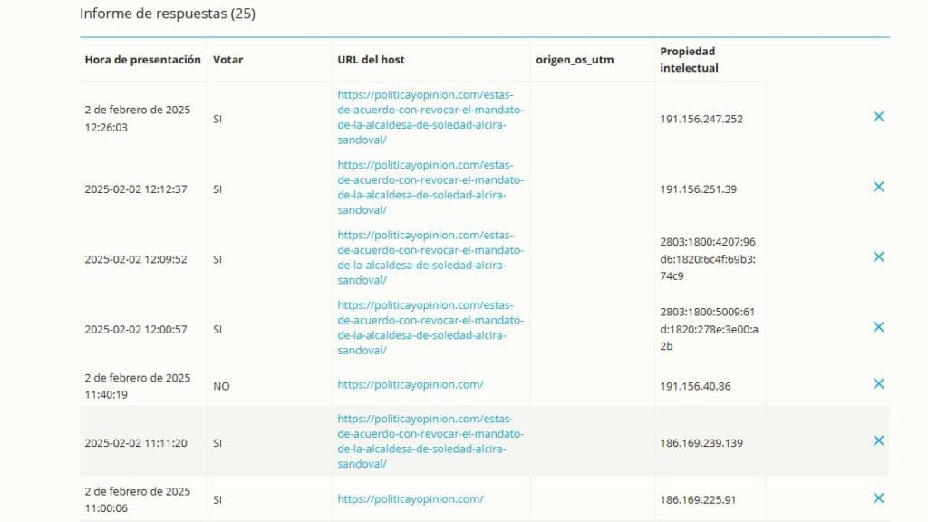 Pero este ejercicio que está diagramado y arrojó unos resultados en la cual sólo estaba habilitado un solo voto, la plataforma no permitía votar dos veces porque de inmediato bloqueaba la IP, esto prueba esta tarea que en Soledad van a salir masivamente a votar por el SÍ a la revocatoria de mandato de la alcaldesa Alcira Sandoval Ibáñez.